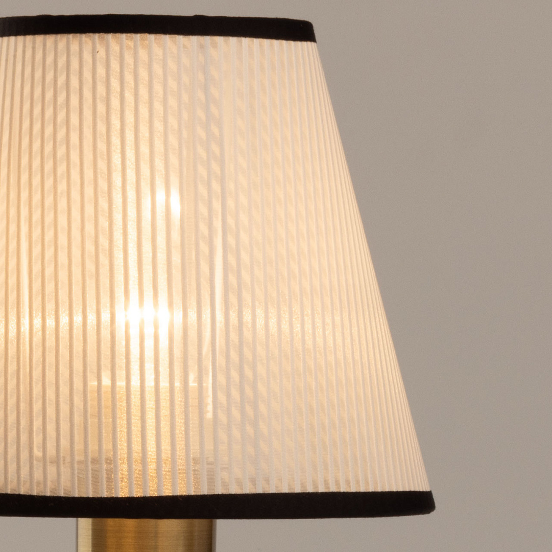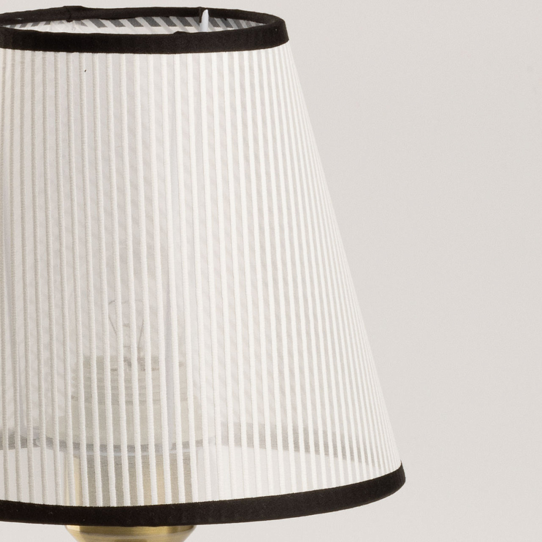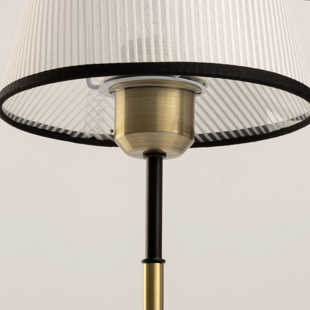 Сочетание цветов античной бронзы и черного выглядит изысканно и сохраняет свою актуальность. Текстильный абажур белого цвета с линейным рисунком создает мягкое освещение, внося уют в пространство комнаты. Термостойкий акрил надежно защищает текстиль абажура. Заменяемый источник света удобен и практичен в эксплуатации.