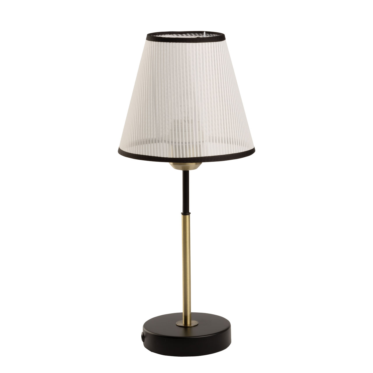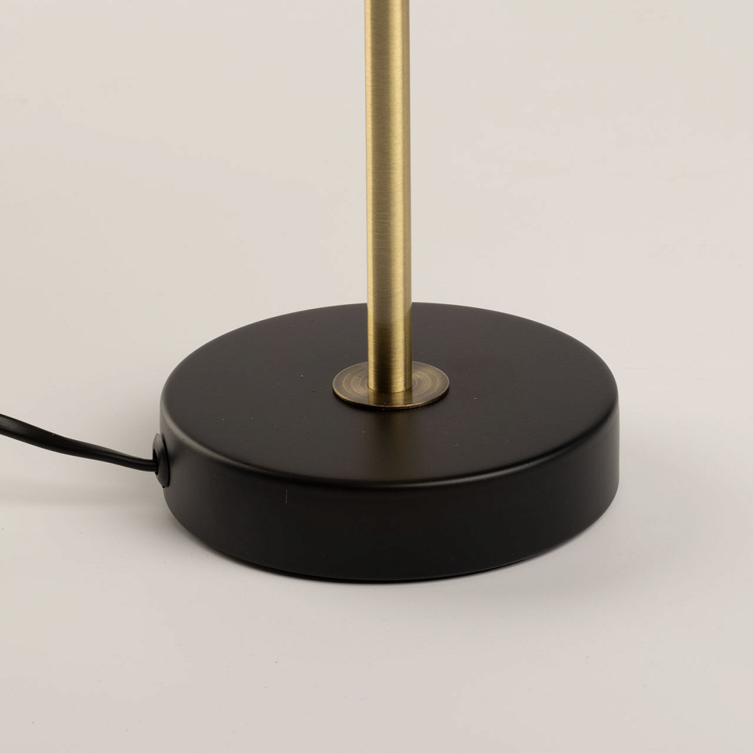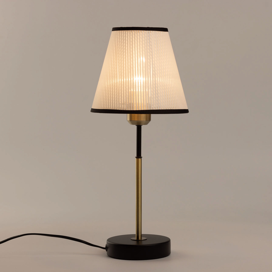 Сочетание цветов античной бронзы и черного выглядит изысканно и сохраняет свою актуальность. Текстильный абажур белого цвета с линейным рисунком создает мягкое освещение, внося уют в пространство комнаты. Термостойкий акрил надежно защищает текстиль абажура. Заменяемый источник света удобен и практичен в эксплуатации.